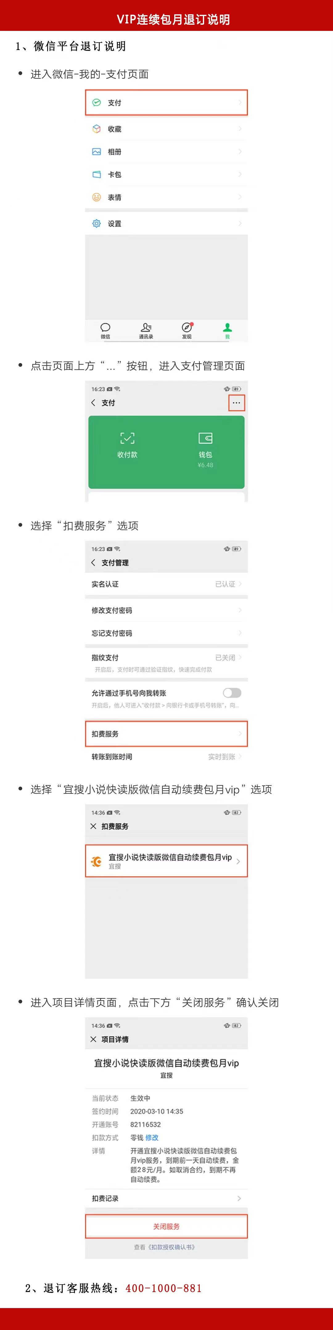 VIP连续包月退订说明)登录“微信-服务-钱包-支付设置-自动续费”操作;或拨打客服电话:4001331008。本业务退订后视作放弃本活动福利,未充值到账或未领取的礼品将不再发放。