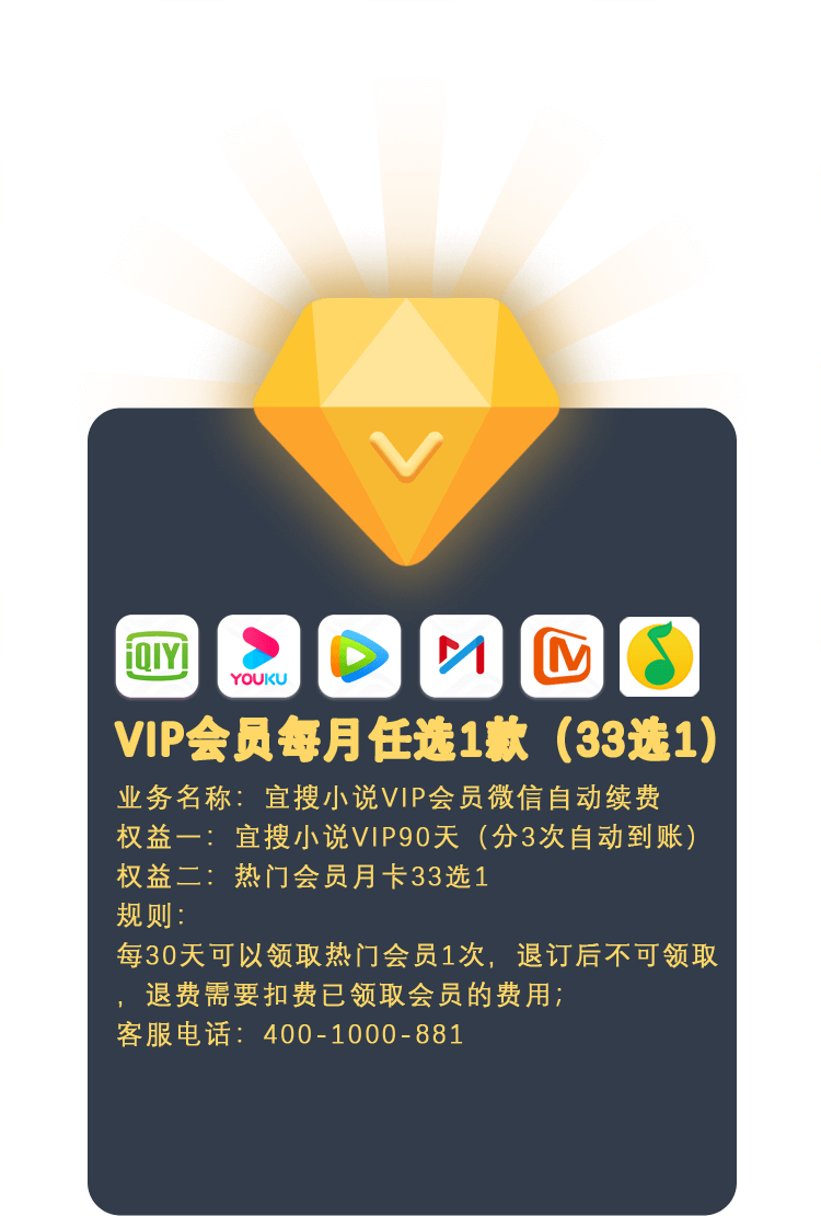 (5)本业务扣费业务名称为:小说VIP会员微信自动续费,按季度续费 40元/季,按次计费68元/次。宣传业务名称:热门互联网会员月月领(33选1)